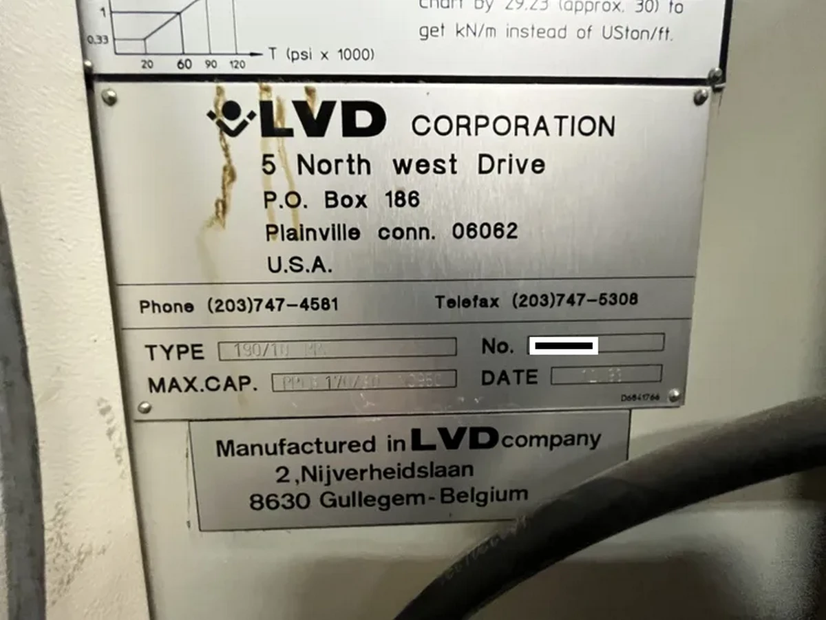 Used LVD 190/10 PPE (1993) CNC Press Brake for Sale. This pre-owned LVD CNC press brake is located in The United States. If you have any questions regarding this LVD Press Brake, please feel free to contact us. You may Activate Pricing to view the price of this CNC Machine, or request a quote by clicking on the Inquire Now button.