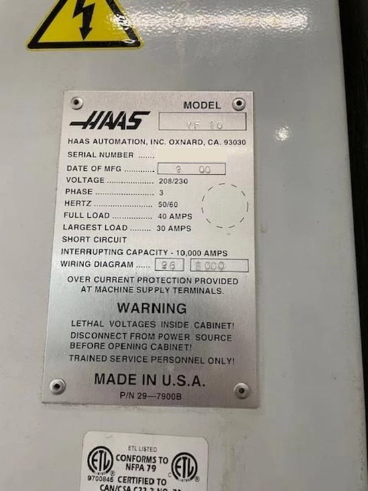 Used Haas VF-10 (2000) CNC Vertical Machining Center for Sale.  This pre-owned Haas CNC vertical mill is located in The United States and available to be seen under power for an inspection.  If you have any questions regarding this Haas Vertical Machining Center, please feel free to contact us.  You may Activate Pricing to view the price of this CNC Machine, or request a quote by clicking on the Inquire Now button.