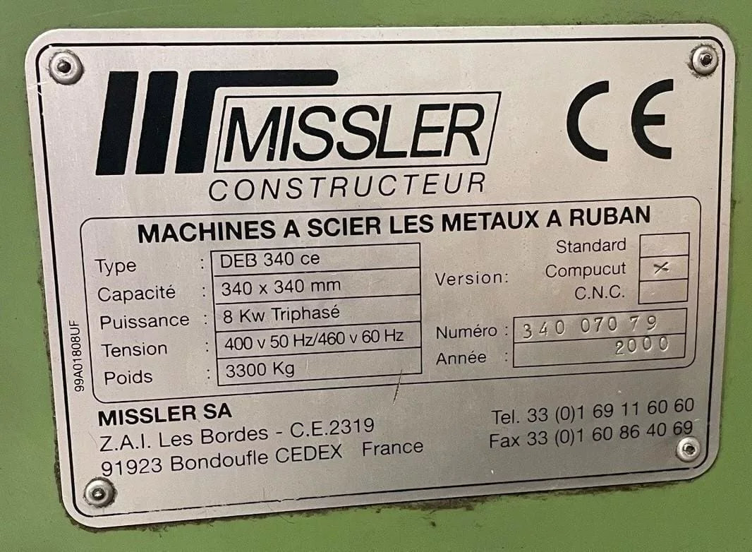 Used Missler DEB 340 CE (2000) Saw for Sale.  This pre-owned Missler automatic horizontal bandsaw is located in Ohio.  If you have any questions regarding this Missler Saw, please feel free to contact us.  You may Activate Pricing to view the price of this CNC Machine, or request a quote by clicking on the Inquire Now button.