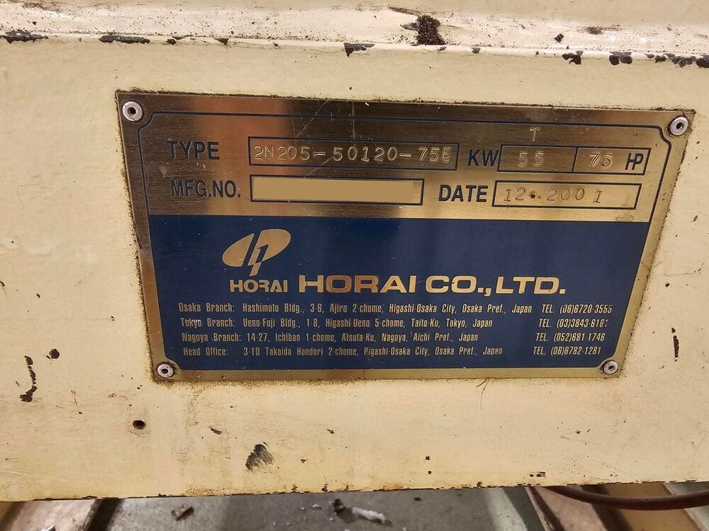 Used Horai Co. Ltd. 2N205-50120-75E (2001) Granulator for Sale.  This pre-owned Horai Co. Ltd. granulator is located in The United States and available to be seen under power for an inspection.  If you have any questions regarding this Horai Co. Ltd. Granulator, please feel free to contact us.  You may Activate Pricing to view the price of this Plastic Processing Machine, or request a quote by clicking on the Inquire Now button.
