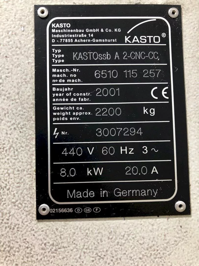 Used Kasto SSB A2-CNC-CC (2001) Saw for Sale.  This pre-owned Kasto automatic vertical bandsaw is located in Ohio.  If you have any questions regarding this Kasto Saw, please feel free to contact us.  You may Activate Pricing to view the price of this CNC Machine, or request a quote by clicking on the Inquire Now button.