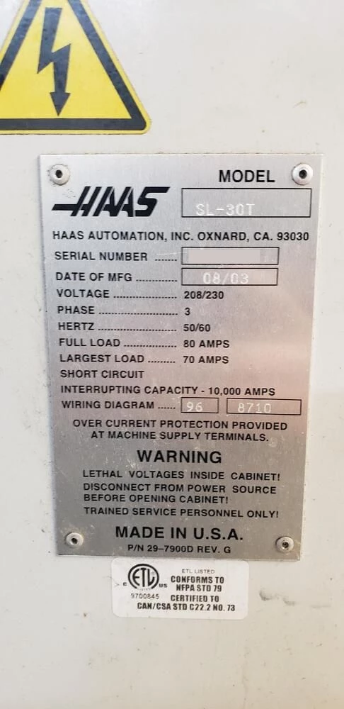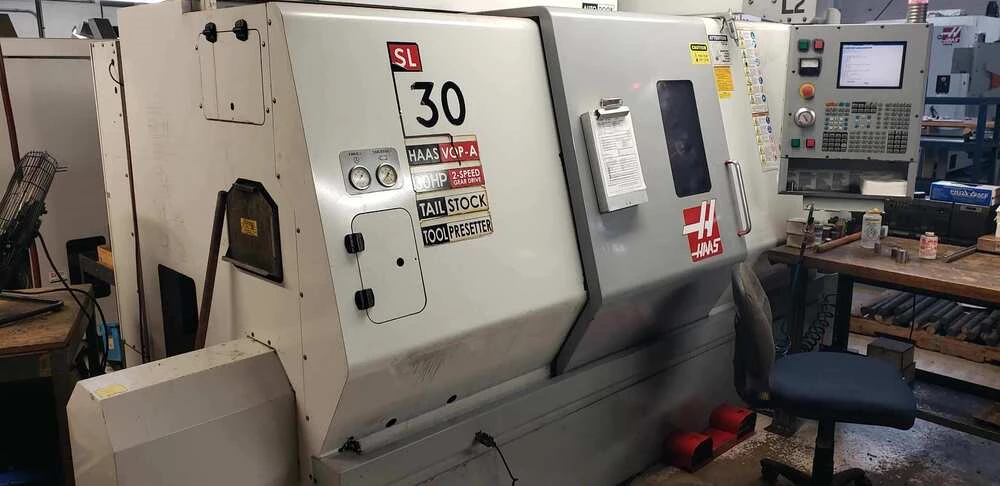 Used Haas SL-30T (2003) CNC Lathe for Sale. This pre-owned Haas CNC lathe is located in The United States and available to be seen under power for an inspection. If you have any questions regarding this Haas Lathe, please feel free to contact us. You may Activate Pricing to view the price of this CNC Machine, or request a quote by clicking on the Inquire Now button.