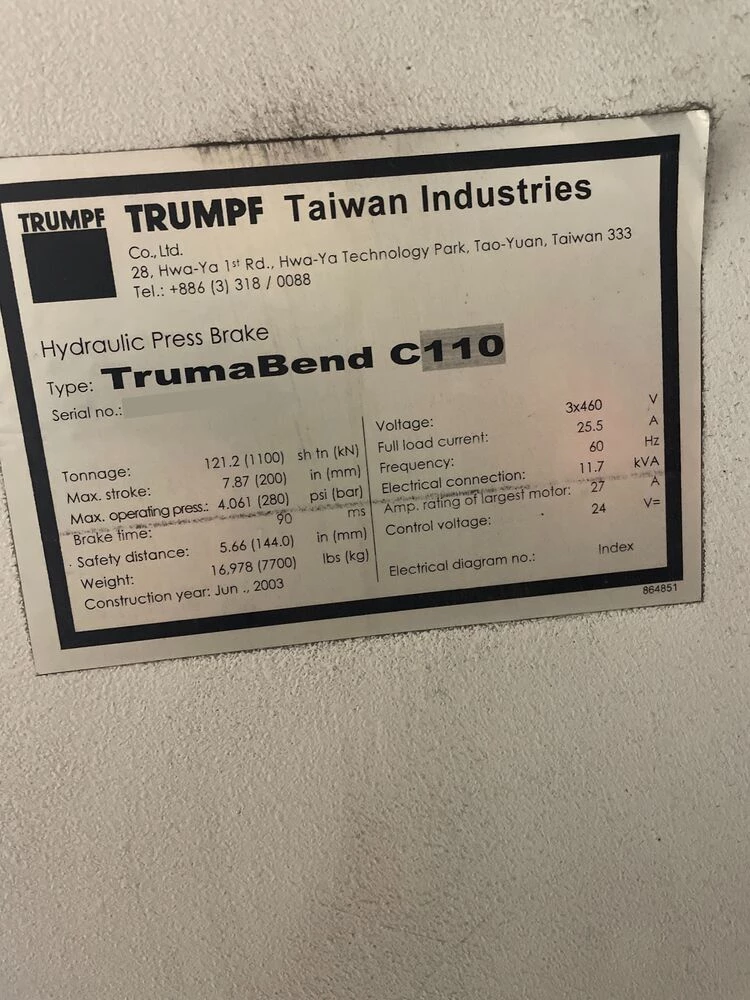 Used Trumpf Trumabend C110 (2003) CNC Press Brake for Sale.  This pre-owned Trumpf CNC press brake is located in The United States.  If you have any questions regarding this Trumpf Press Brake, please feel free to contact us.  You may Activate Pricing to view the price of this CNC Machine, or request a quote by clicking on the Inquire Now button.