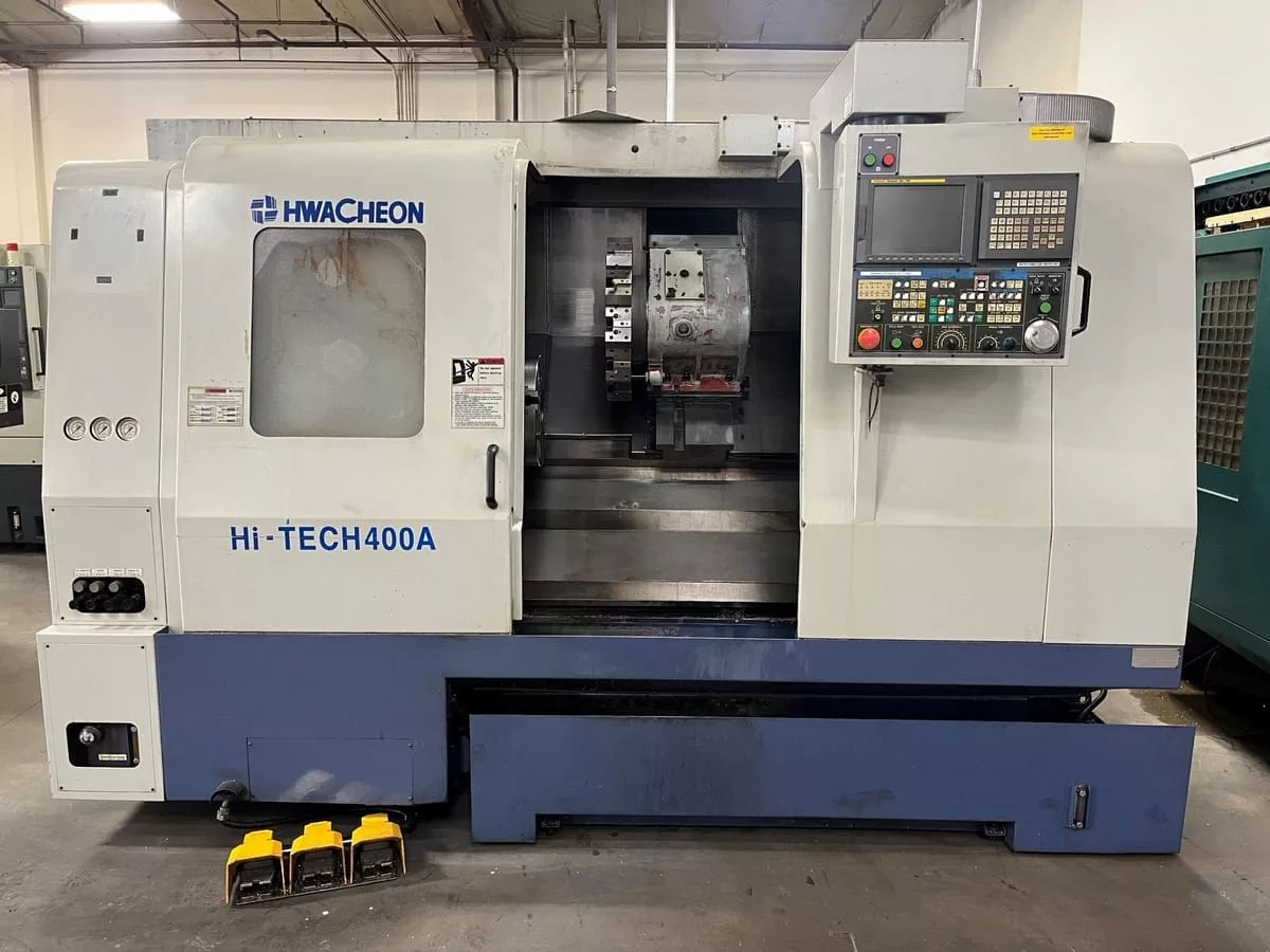 Used Hwacheon Hi-Tech 400A (2004) CNC Lathe for Sale.  This pre-owned Hwacheon CNC lathe is located in The United States and available to be seen under power for an inspection.  If you have any questions regarding this Hwacheon Lathe, please feel free to contact us.  You may Activate Pricing to view the price of this CNC Machine, or request a quote by clicking on the Inquire Now button.