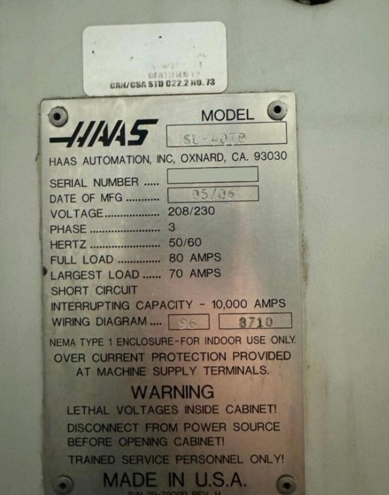 Used Haas SL-40TB (2006) CNC Lathe for Sale. This pre-owned Haas CNC lathe is located in Canada and available to be seen under power for an inspection. If you have any questions regarding this Haas Lathe, please feel free to contact us. You may Activate Pricing to view the price of this CNC Machine, or request a quote by clicking on the Inquire Now button.