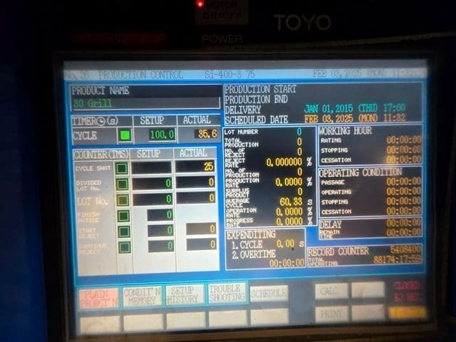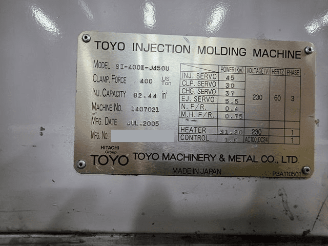 Used Toyo Si-400III (2005/2006) Injection Molding Machine for Sale. This pre-owned Toyo plastic injection molding machine is located in The United States and available to be seen under power for an inspection. If you have any questions regarding this Toyo Injection Molding Machine, please feel free to contact us. You may Activate Pricing to view the price of this Plastic Molding Machine, or request a quote by clicking on the Inquire Now button.