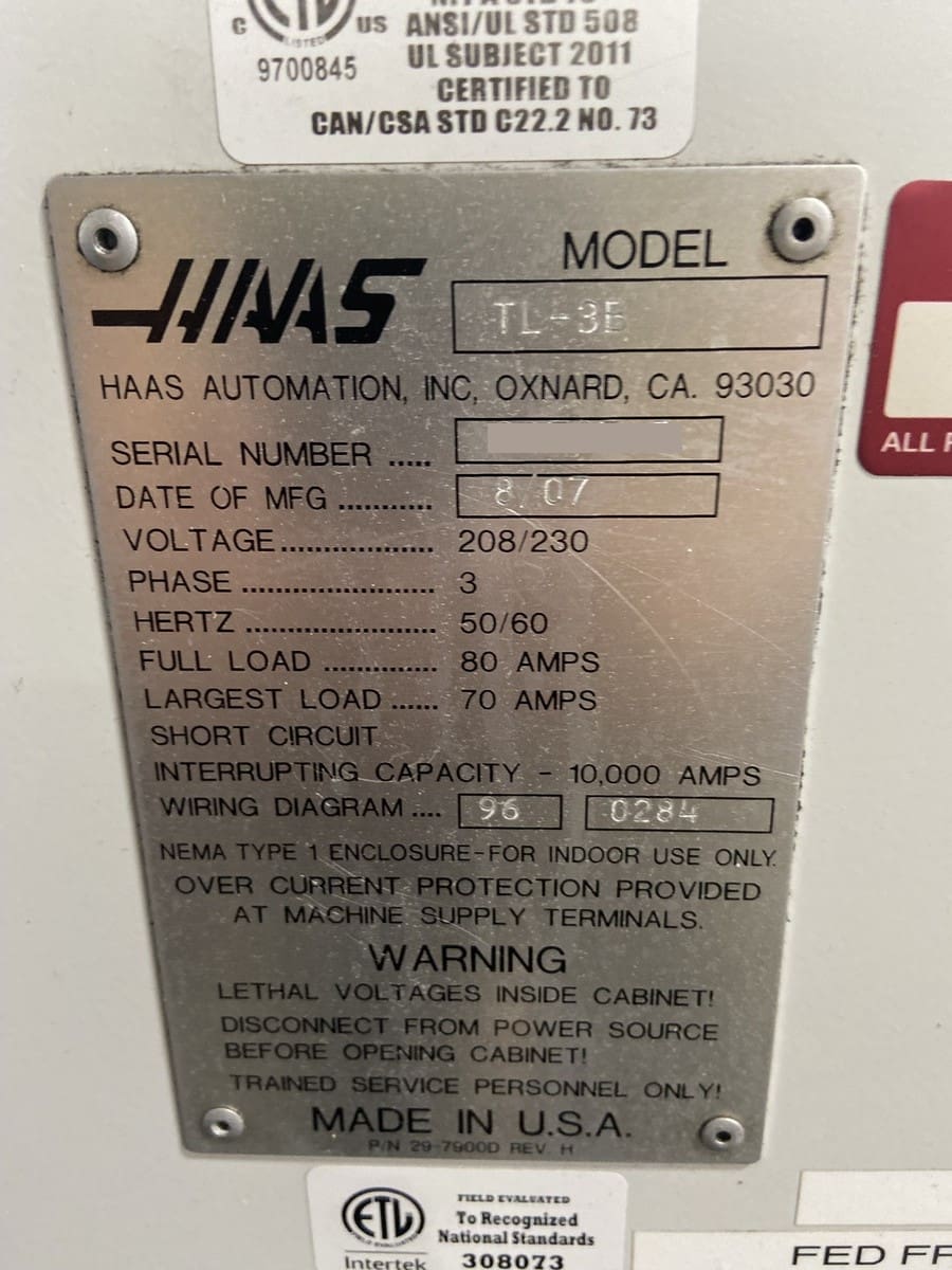 Used Haas TL-3B (2007) CNC Lathe for Sale.  This pre-owned Haas CNC lathe is located in The United States and available to be seen under power for an inspection.  If you have any questions regarding this Haas Lathe, please feel free to contact us.  You may Activate Pricing to view the price of this CNC Machine, or request a quote by clicking on the Inquire Now button.