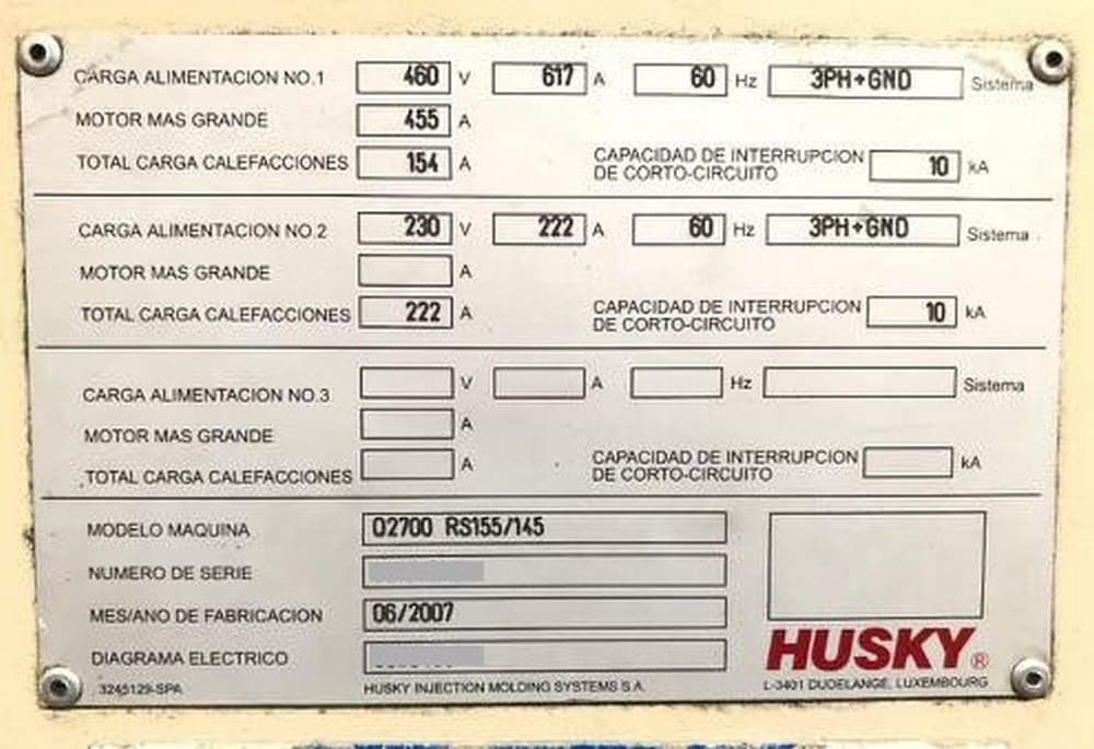 Used Husky 2700 RS155/145 (2007) Injection Molding Machine for Sale. This pre-owned Husky plastic injection molding machine is available to be seen under power for an inspection. If you have any questions regarding this Husky Injection Molding Machine, please feel free to contact us. You may Activate Pricing to view the price of this Plastic Molding Machine, or request a quote by clicking on the Inquire Now button.