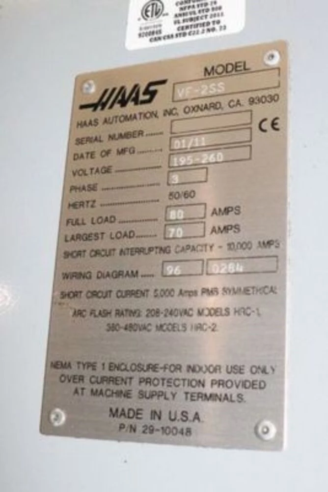 Used Haas VF-2SS (2011) CNC Vertical Machining Center for Sale. This pre-owned Haas CNC vertical mill is located in The United States and available to be seen under power for an inspection. If you have any questions regarding this Haas Vertical Machining Center, please feel free to contact us. You may Activate Pricing to view the price of this CNC Machine, or request a quote by clicking on the Inquire Now button.