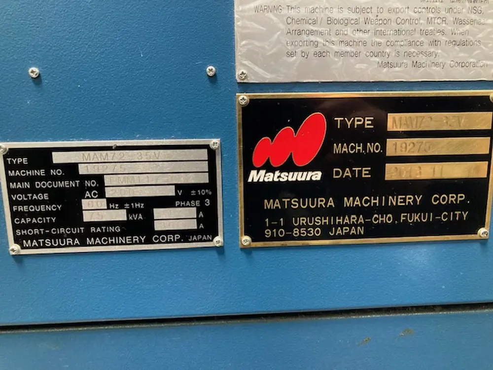 Used Matsuura MAM72-35V (2013) CNC Vertical Machining Center for Sale. This pre-owned Matsuura CNC vertical mill is located in The United States and available to be seen under power for an inspection. If you have any questions regarding this Matsuura Vertical Machining Center, please feel free to contact us. You may Activate Pricing to view the price of this CNC Machine, or request a quote by clicking on the Inquire Now button.
