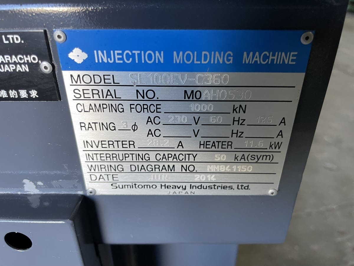 Used Sumitomo SE 100EV-360 (2014) Injection Molding Machine for Sale. This pre-owned Sumitomo plastic injection molding machine is located in California and available to be seen under power for an inspection. If you have any questions regarding this Sumitomo Injection Molding Machine, please feel free to contact us. You may Activate Pricing to view the price of this Plastic Molding Machine, or request a quote by clicking on the Inquire Now button.