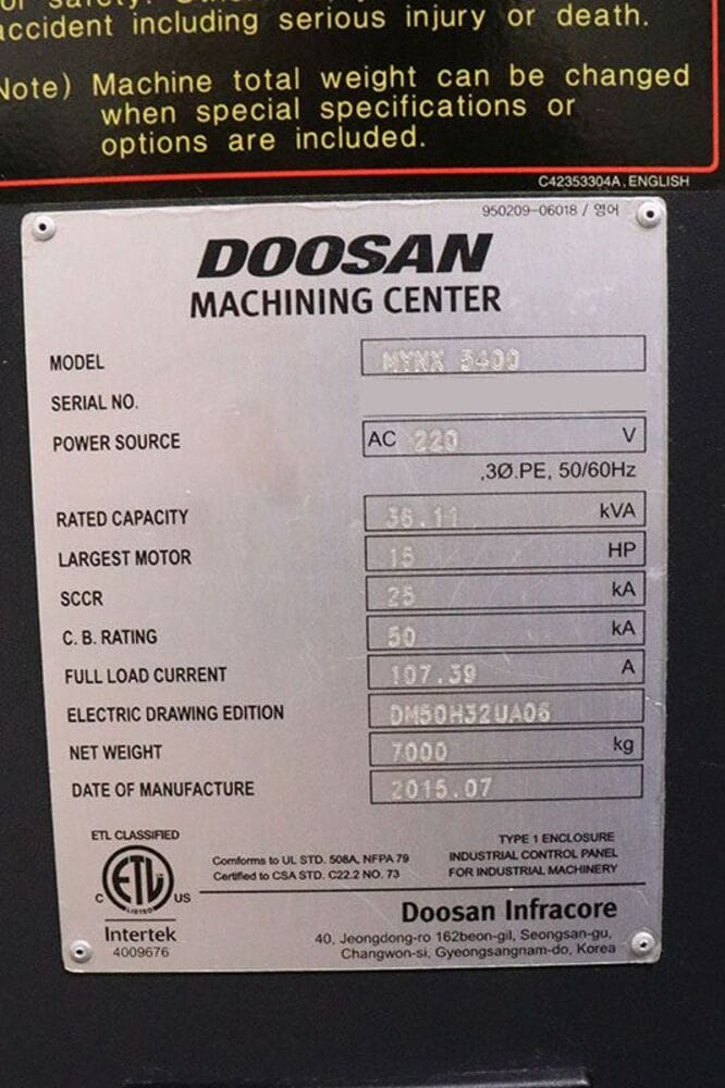 Used Doosan Mynx 5400 (2015) CNC Vertical Machining Center for Sale.  This pre-owned Doosan CNC vertical mill is located in The United States and available to be seen under power for an inspection.  If you have any questions regarding this Doosan Vertical Machining Center, please feel free to contact us.  You may Activate Pricing to view the price of this CNC Machine, or request a quote by clicking on the Inquire Now button.