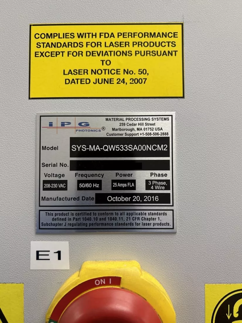 Used IPG SYS-MA-QW533SA00NCM2 (2016) CNC Laser for Sale. This pre-owned IPG CNC laser cutter is located in The United States and available to be seen under power for an inspection. If you have any questions regarding this IPG Laser, please feel free to contact us. You may Activate Pricing to view the price of this CNC Machine, or request a quote by clicking on the Inquire Now button.