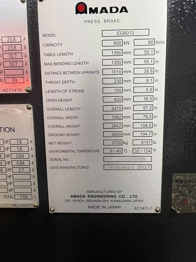 Used Amada EG 6013 (2017) CNC Press Brake for Sale. This pre-owned Amada CNC press brake is located in The United States. If you have any questions regarding this Amada Press Brake, please feel free to contact us. You may Activate Pricing to view the price of this CNC Machine, or request a quote by clicking on the Inquire Now button.