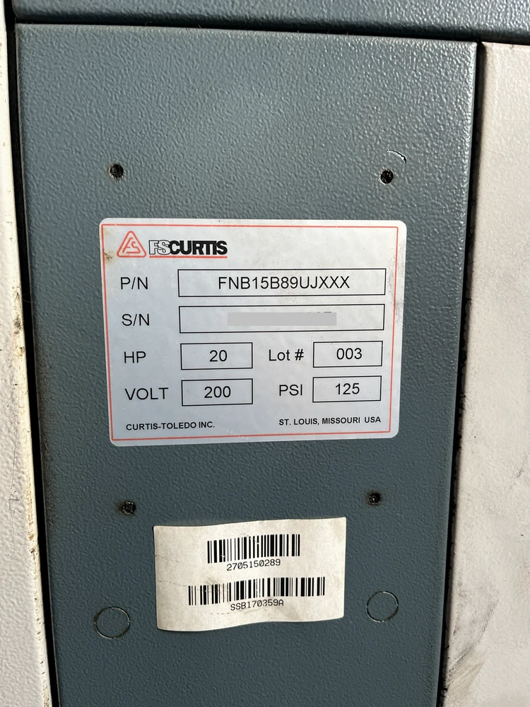 Used FS Curtis FNB15 (2018) Air Compressor for Sale. This pre-owned FS Curtis air compressor is located in The United States and available to be seen under power for an inspection. If you have any questions regarding this FS Curtis Air Compressor, please feel free to contact us. You may Activate Pricing to view the price of this air compressor, or request a quote by clicking on the Inquire Now button.