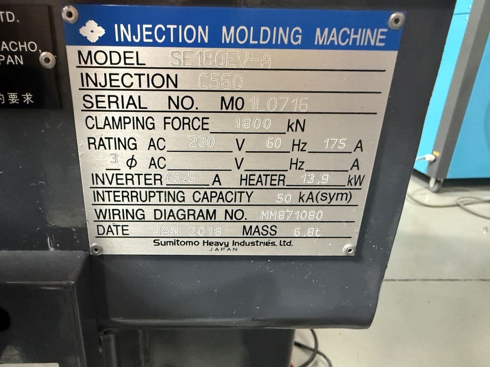Used Sumitomo SE180EVA-C560 (2018) Injection Molding Machine for Sale.  This pre-owned Sumitomo plastic injection molding machine is located in Arizona and available to be seen under power for an inspection.  If you have any questions regarding this Sumitomo Injection Molding Machine, please feel free to contact us.  You may Activate Pricing to view the price of this Plastic Molding Machine, or request a quote by clicking on the Inquire Now button.
