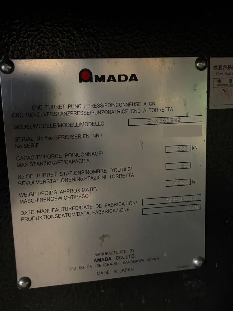Used Amada EMK 3612M2 (2019) Turret Punch for Sale.  This pre-owned Amada turret punch is located in the United States.  If you have any questions regarding this Amada Turret Punch, please feel free to contact us.  You may Activate Pricing to view the price of this CNC Machine, or request a quote by clicking on the Inquire Now button.