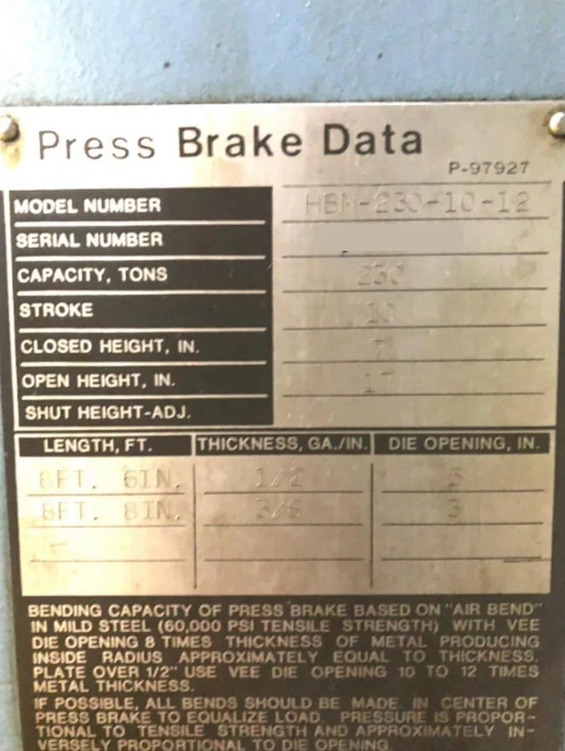 Used Niagara HBM 230-10-12 CNC Press Brake for Sale.  This pre-owned Niagara CNC press brake is located in The United States.  If you have any questions regarding this Niagara Press Brake, please feel free to contact us.  You may Activate Pricing to view the price of this CNC Machine, or request a quote by clicking on the Inquire Now button.
